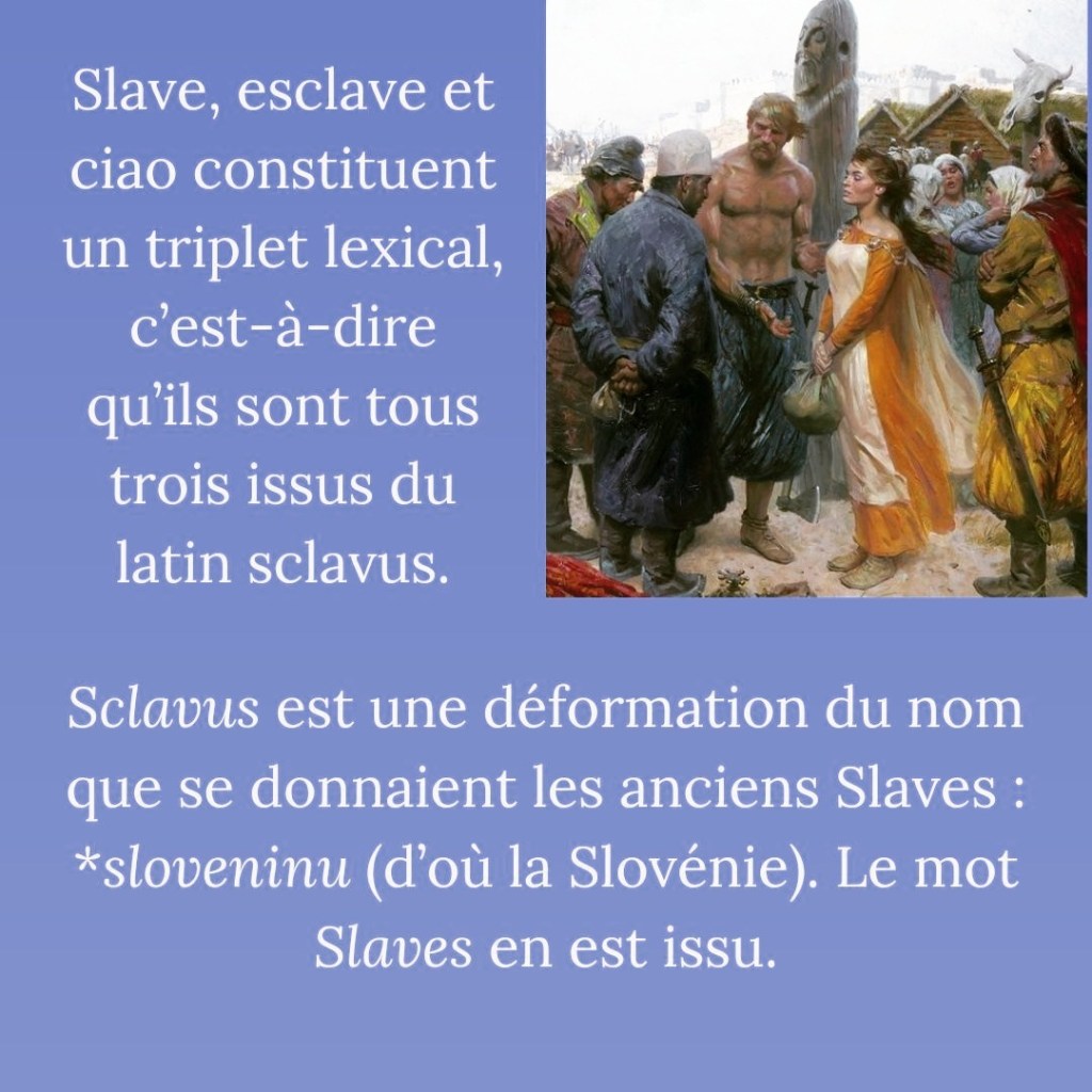 Slave, esclave et ciao (voir post précédent) constituent un triplet lexical, c’est-à-dire qu’ils sont tous trois issus du latin médiéval sclavus.