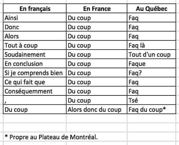 Savez-vous que quand un Québécois veut imiter un Français, il met des « du coup » dans toutes ses phrases, comme le « une fois » pour les Belges ? Parfois, ils désignent même les Français comme les « du coup » !
