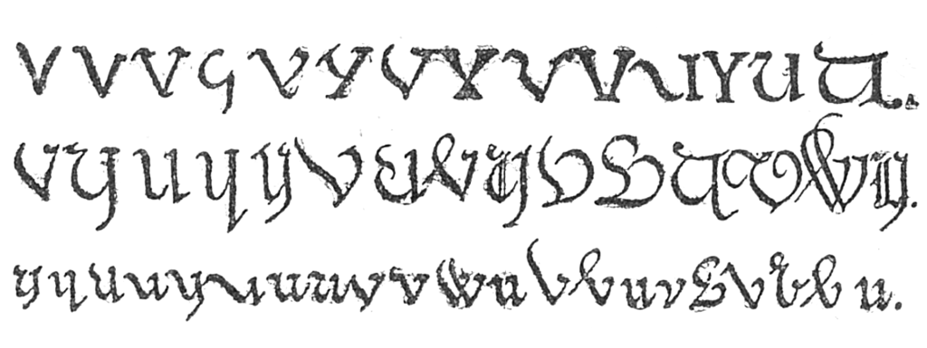 Ce qui complique les choses, c’est qu’au  Moyen-Âge  la minuscule v a des réalisations graphiques différentes, tantôt angulaires (>V), en début de mot, tantôt arrondies (>U), dans le mot ; ainsi viure note « vivre »; vne note « une », pas facile à distinguer de « vue » dans une graphie hâtive