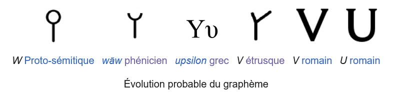> Pour remonter plus loin : la lettre V en latin est héritée de l’alphabet étrusque, lui-même hérité de l’alphabet grec. En grec, une autre graphie de cette même lettre a donné Y (prononcé [u] ou [ü]). Si on remonte plus haut, Y remonte au waw 𐤅 phénicien, qui note le son [u]. C’est lui qui a donné la lettre hébraïque ו et l’arabe . Si on calcule bien, ça fait donc qu’une seule lettre grecque, le Y,  a donné en fait quatre lettres latines : V, U, Y (réemprunté au grec) et W (qu’il a fallu réiventer pour noter le son d’origine de V). Et une seule lettre phénicienne, le waw, a donné cinq lettres latines: car F en est aussi issu! Joli, non?
