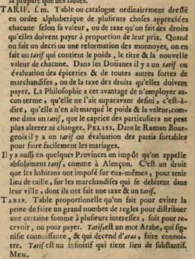 A l’origine, en français, TARIF garde un sens concret. Dans le dictionnaire de Furetière (1690), TARIF désigne ainsi un support matériel :